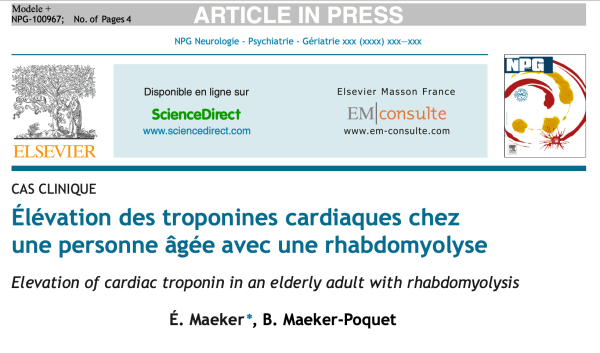 Une femme de 82 ans est hospitalisée après une chute avec un séjour prolongé au sol. Une rhabdomyolyse est diagnostiquée ainsi qu’une élévation massive des troponines cardiaques à haute sensibilité isoforme T. L’évaluation cardiaque est rassurante et elle est transférée dans une unité de gériatrie aiguë. L’hydratation est établie. En quelques jours, les troponines se normalisent. Cette situation clinique interroge les causes de l’élévation de la troponine en dehors des syndromes coronariens aigus et plus particulièrement en cas de rhabdomyolyse chez le sujet âgé.